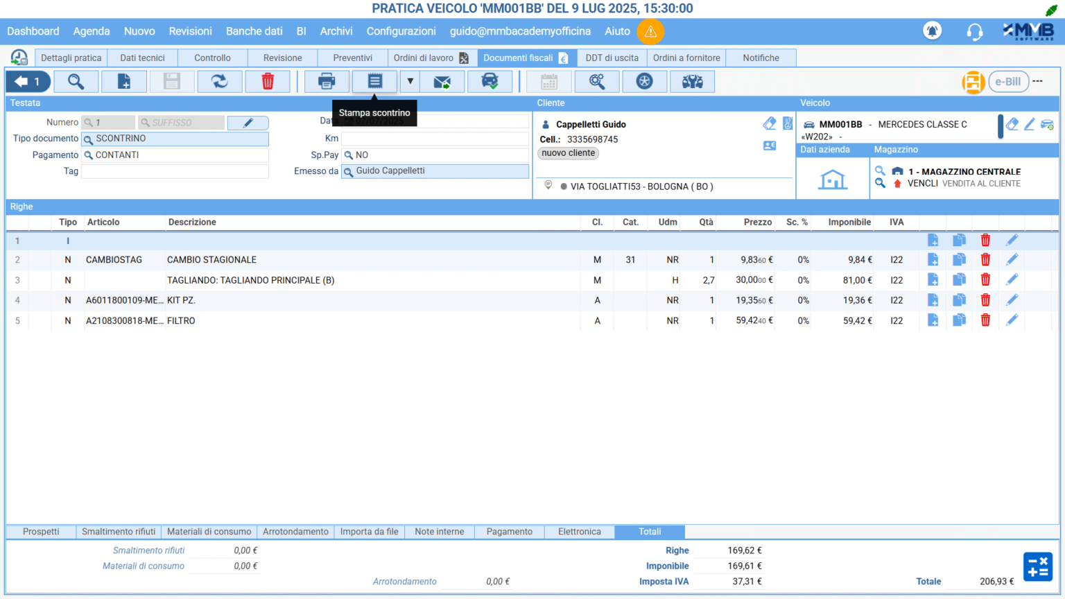 Scontrino parlante per l’inserimento di CF o P.IVA e personalizzabile con i dettagli dell’officina o con messaggi pubblicitari