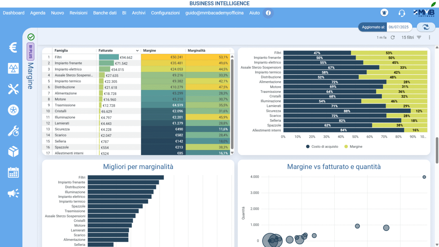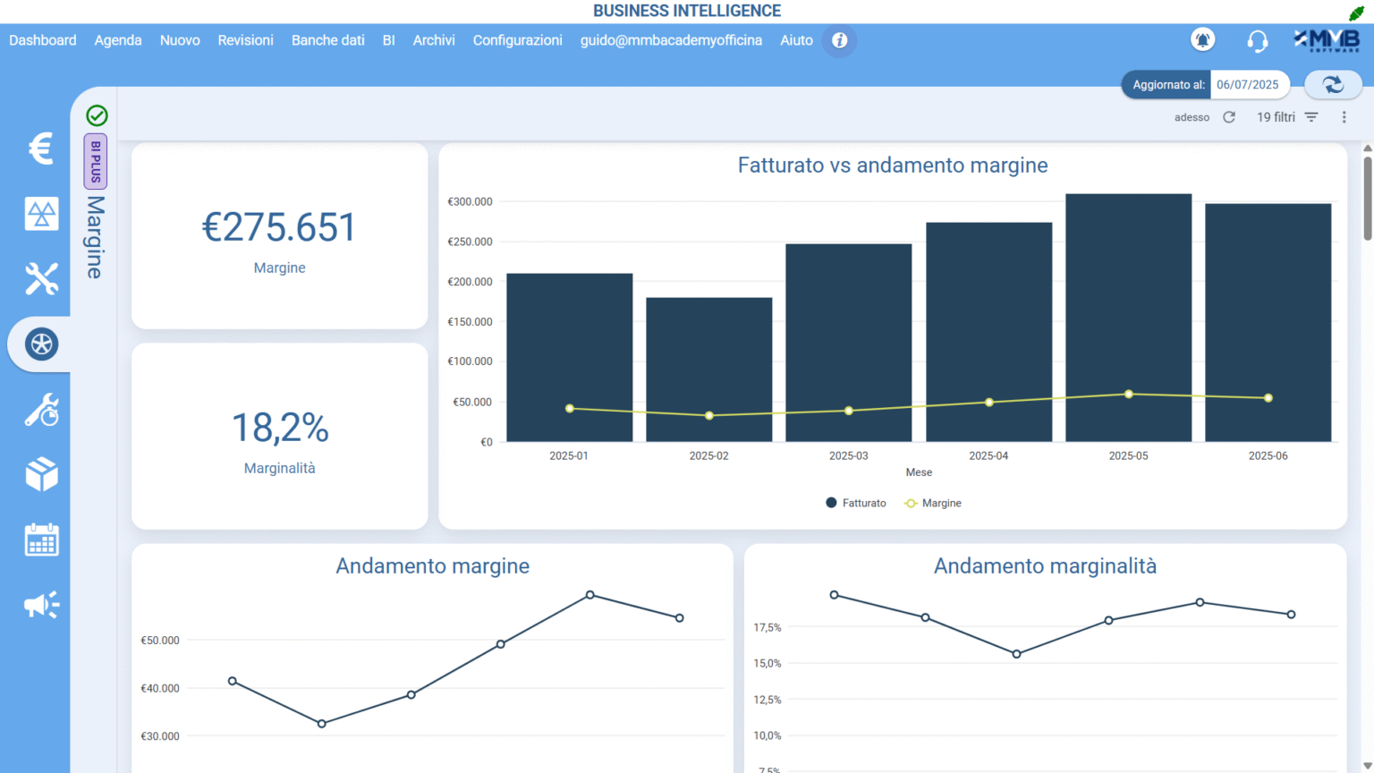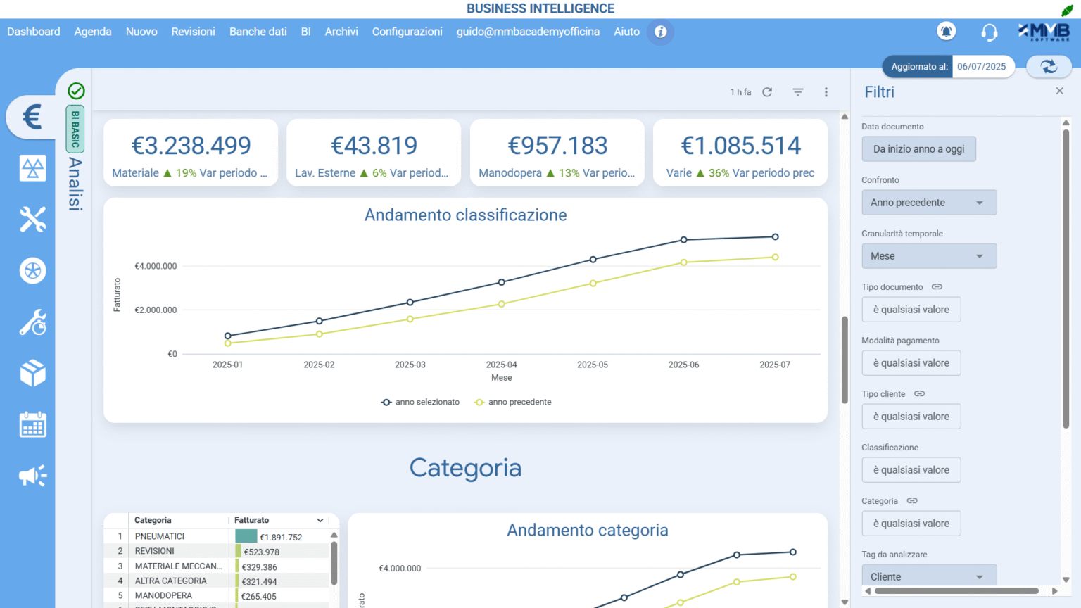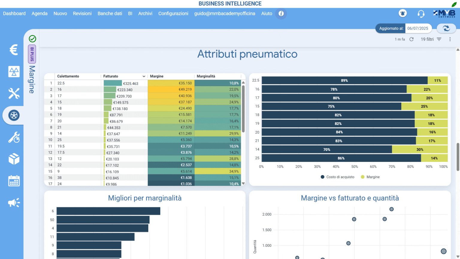 La business intelligence integrata nel software per officine, gommisti e centri revisione YAP, raccoglie tutti i dati che quotidianamente inserisci sul tuo gestionale e li organizza in dashboard via via più articolate, per rispondere a tutte le tue domande, da quelle più semplici alle più evolute.