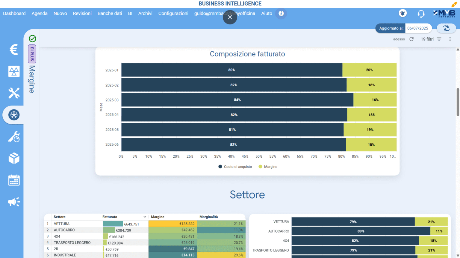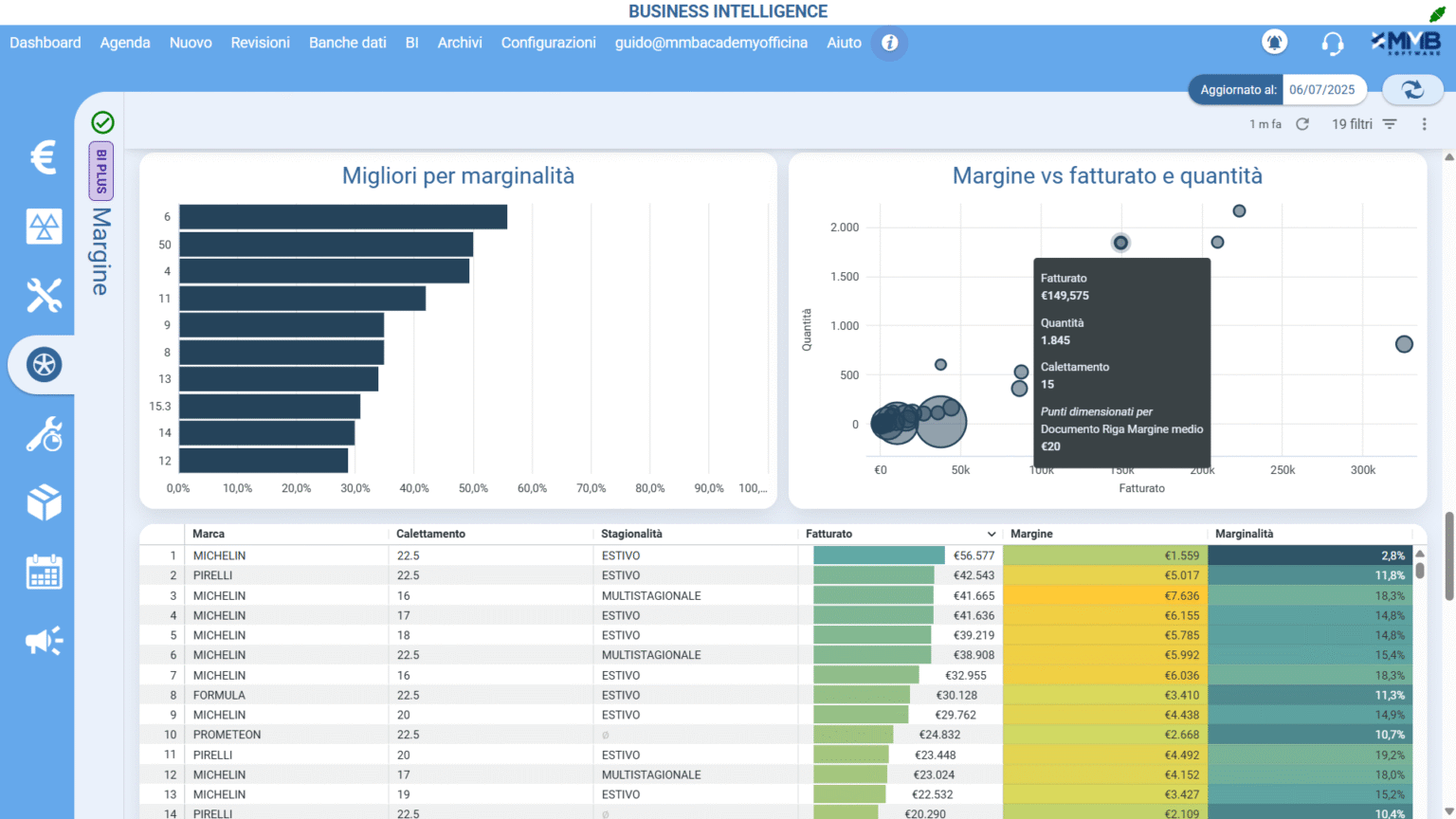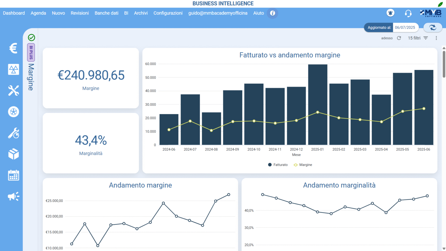 La business intelligence integrata nel software per officine, gommisti e centri revisione YAP, raccoglie tutti i dati che quotidianamente inserisci sul tuo gestionale e li organizza in dashboard via via più articolate, per rispondere a tutte le tue domande, da quelle più semplici alle più evolute.