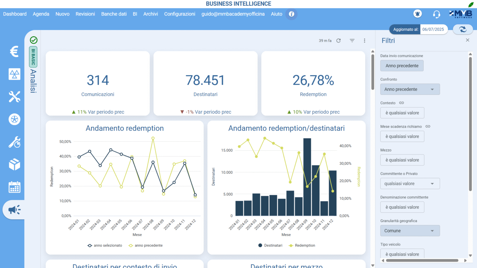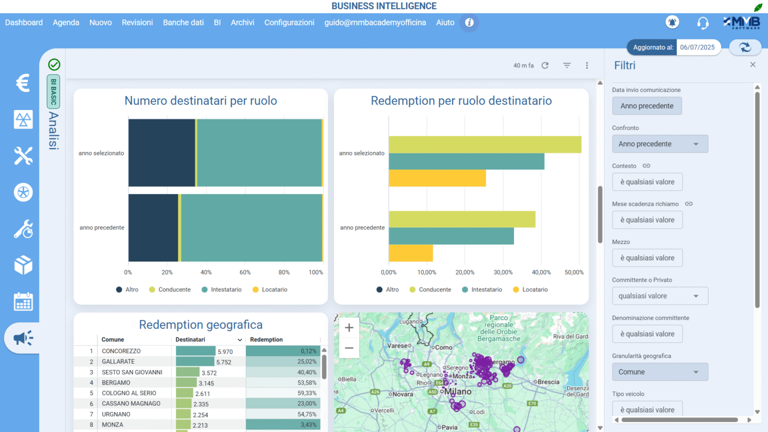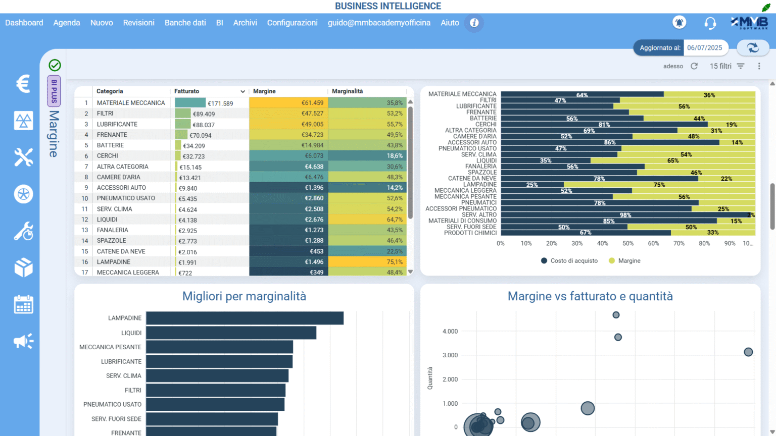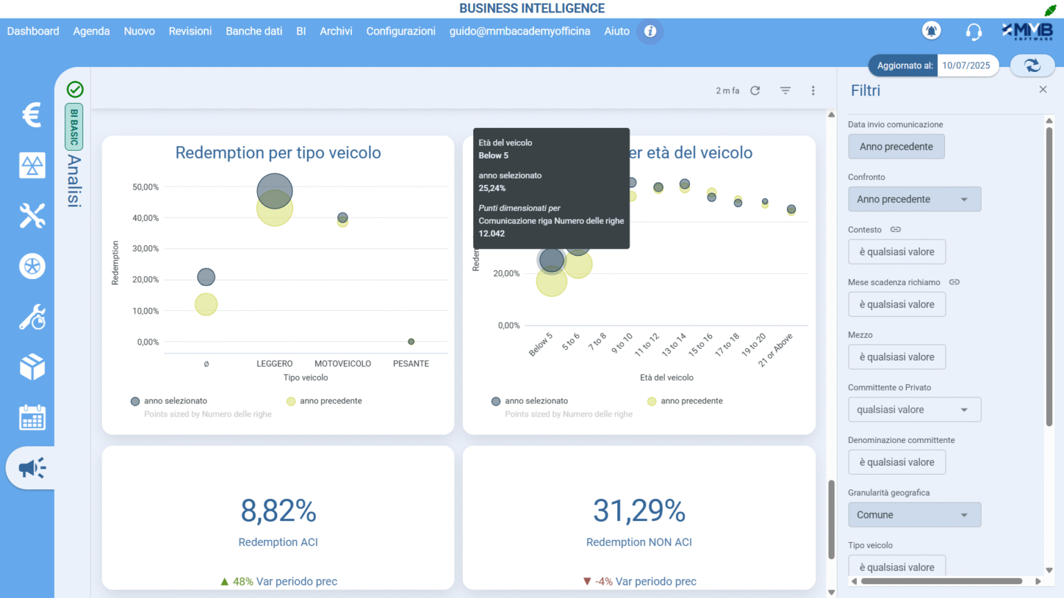La business intelligence integrata nel software per officine, gommisti e centri revisione YAP, raccoglie tutti i dati che quotidianamente inserisci sul tuo gestionale e li organizza in dashboard via via più articolate, per rispondere a tutte le tue domande, da quelle più semplici alle più evolute.