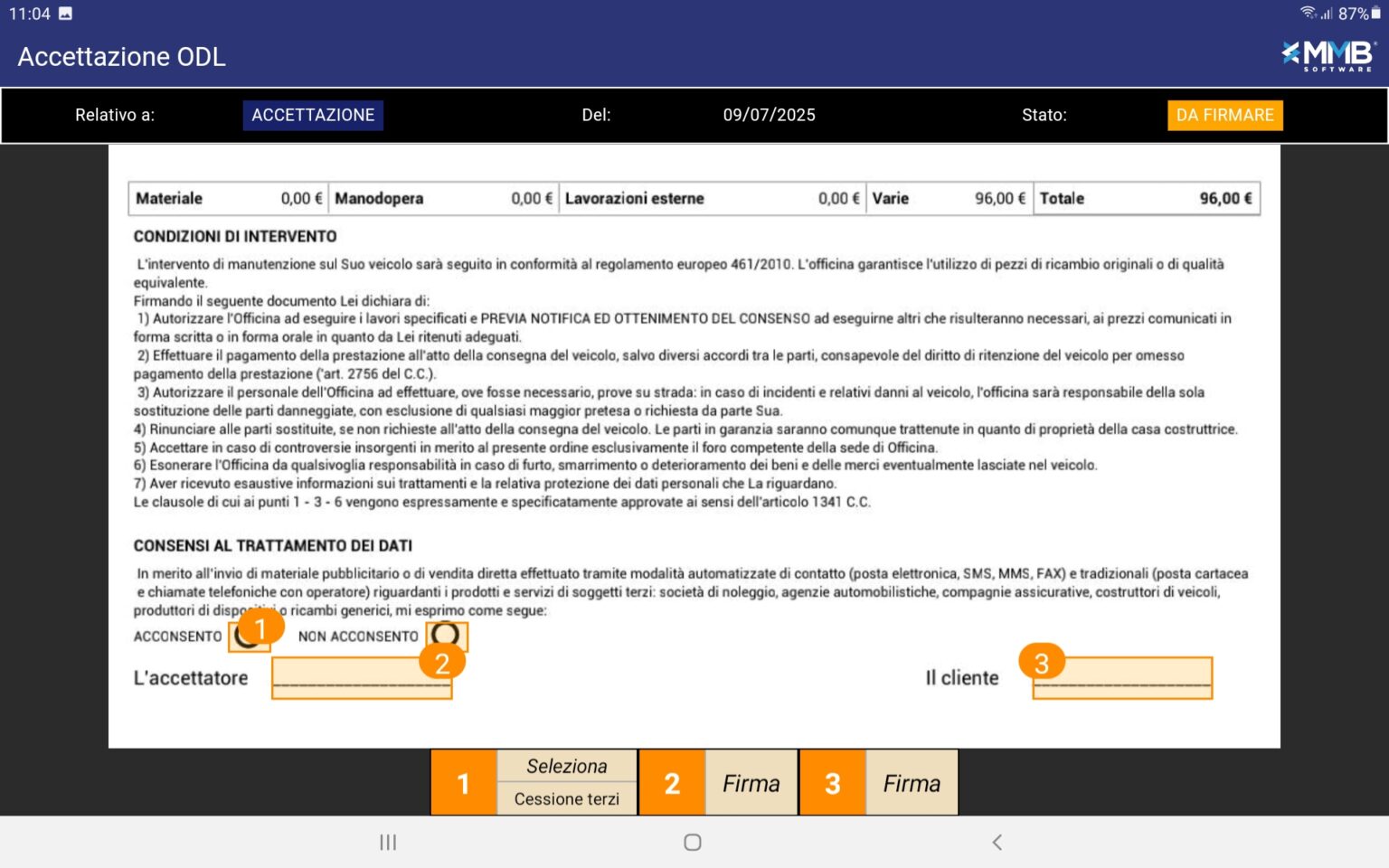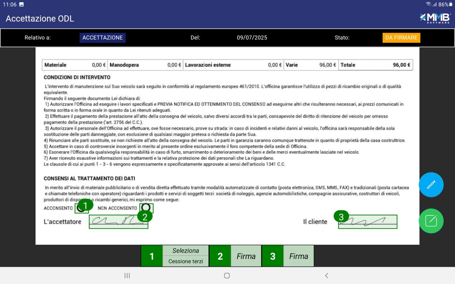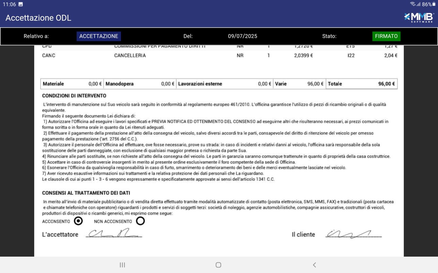 Possibilità di sottoscrivere e archiviare in formato elettronico qualsiasi tipo di documento (es. informative e consensi privacy, accettazione preventivo, accettazione ordine di lavoro, documento di deposito)