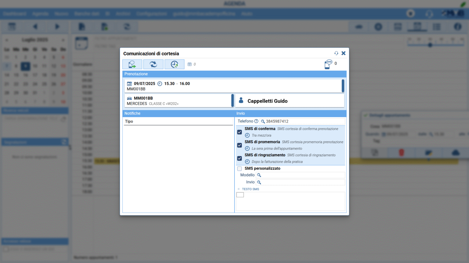 Possibilità di impostare e personalizzare SMS di cortesia automatici per promemoria